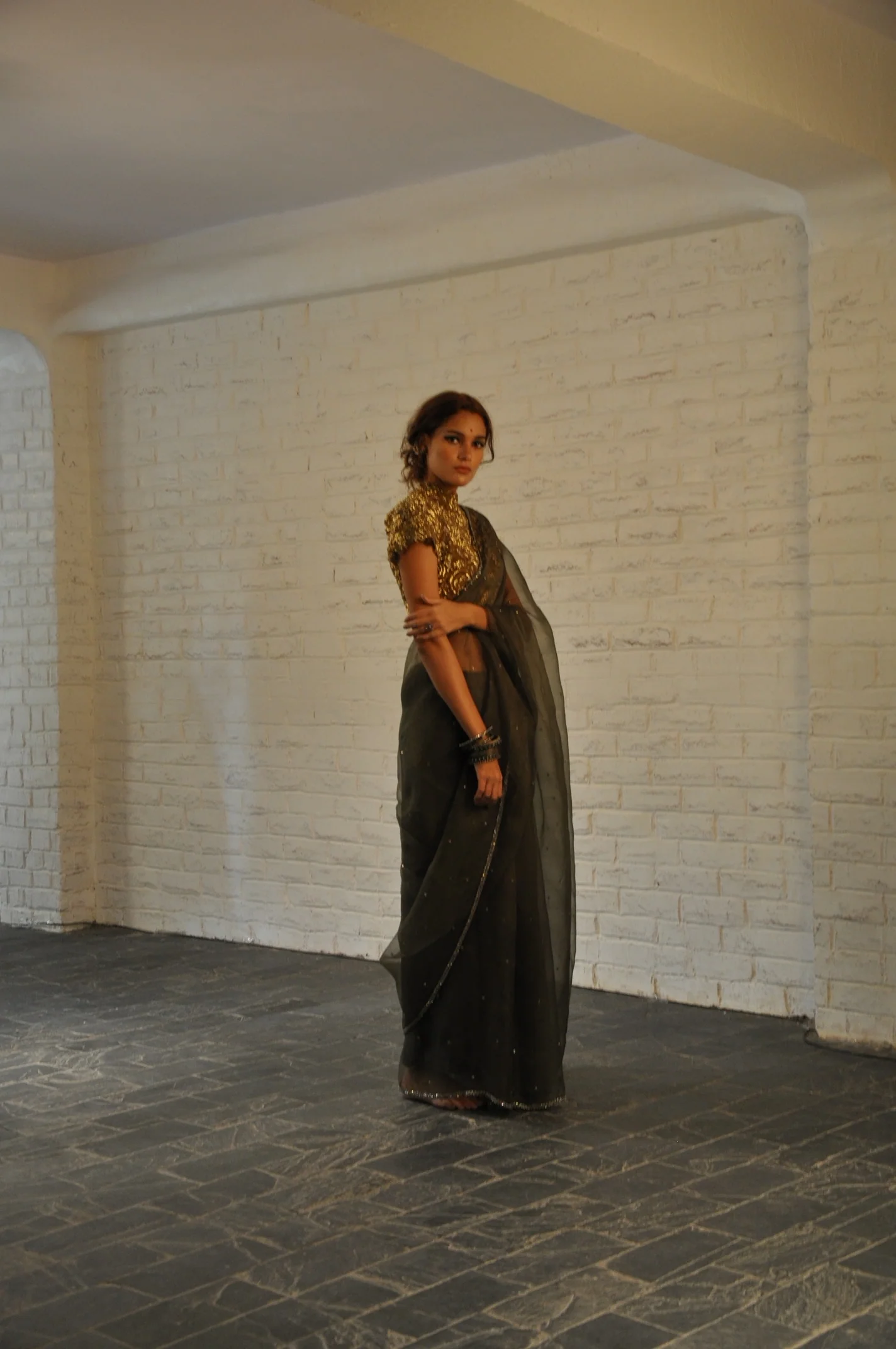 A classic glass bead hand embroidered blouse in gold worn with a contrasting olive green organza sari highlighted with sprinkles and embroidered edges.