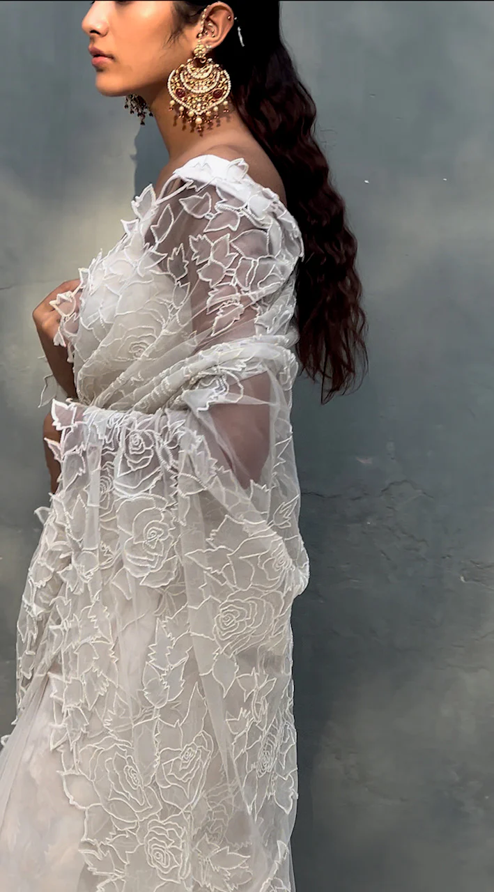 A tulle sari applique in signature rose motifs highlighted with glass beads worn with a fully embroidered/ plain silk petticoat.