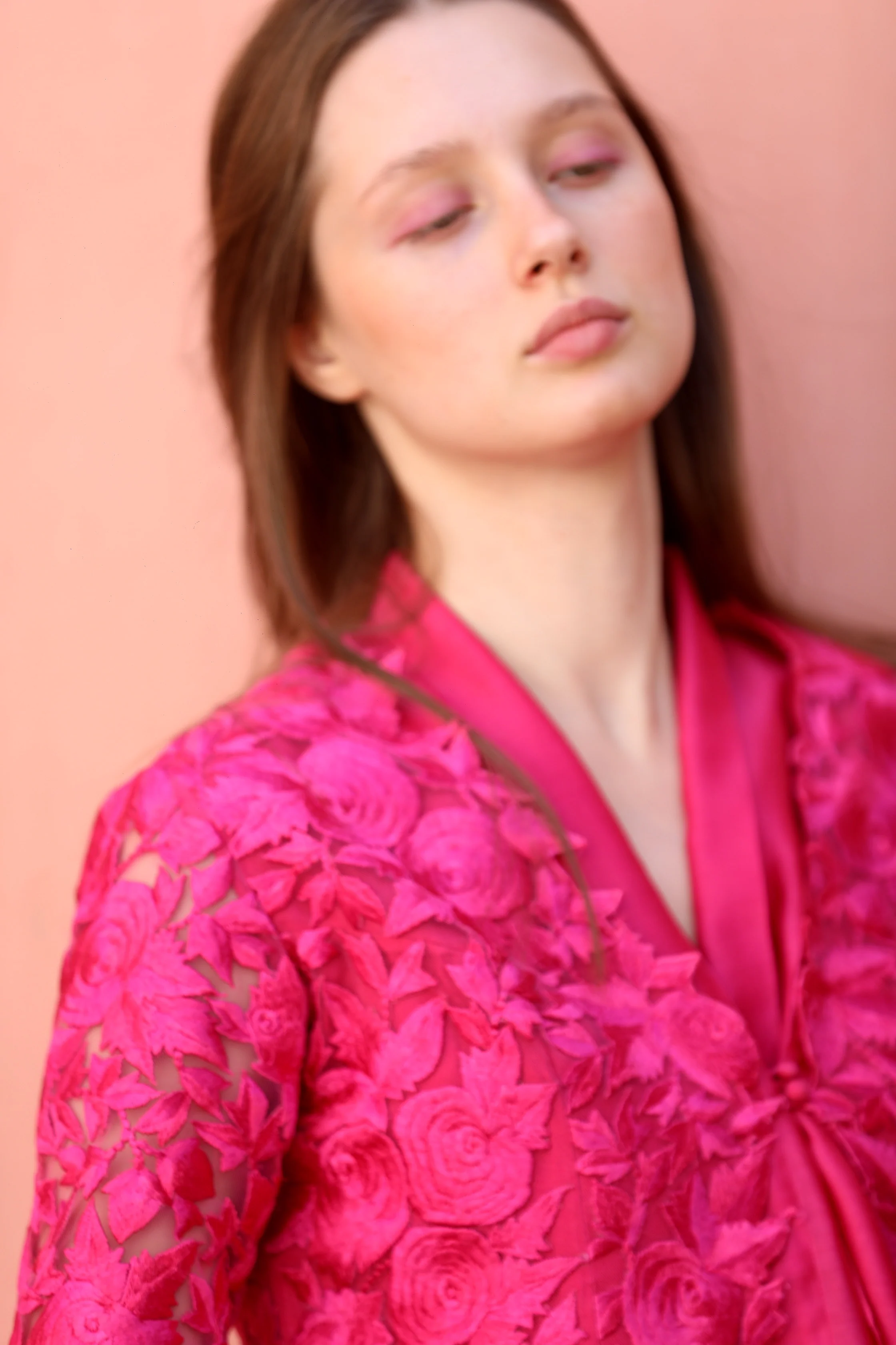 A Rani pink thread embroidered low and high jacket worn with a chanderi single button asymmetric top and signature low crotch flap pants in Shantung.