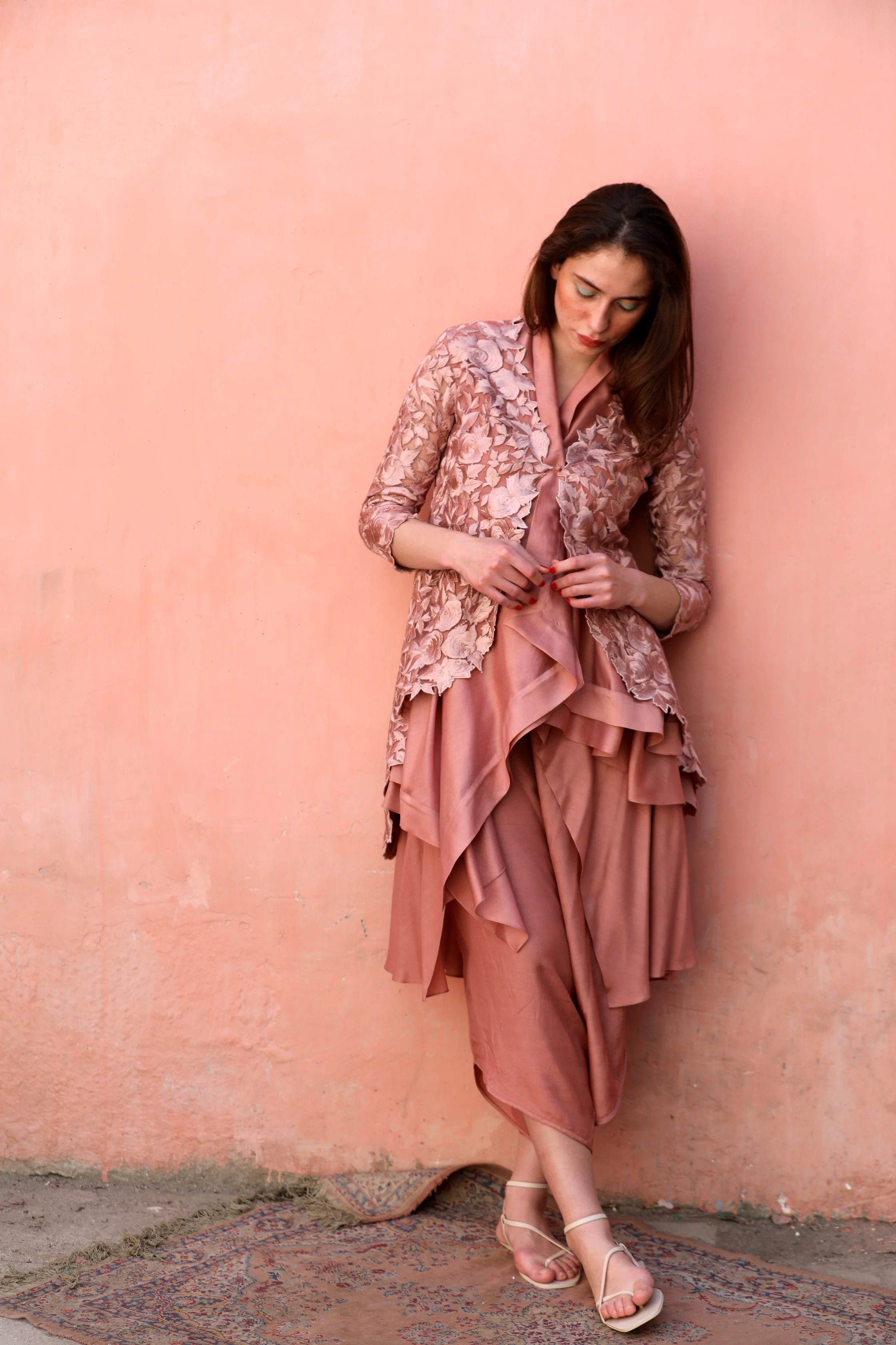 A Salmon Pink thread embroidered low and high jacket in tulle worn with a chanderi single button asymmetric top and signature low crotch flap pants in Shantung.