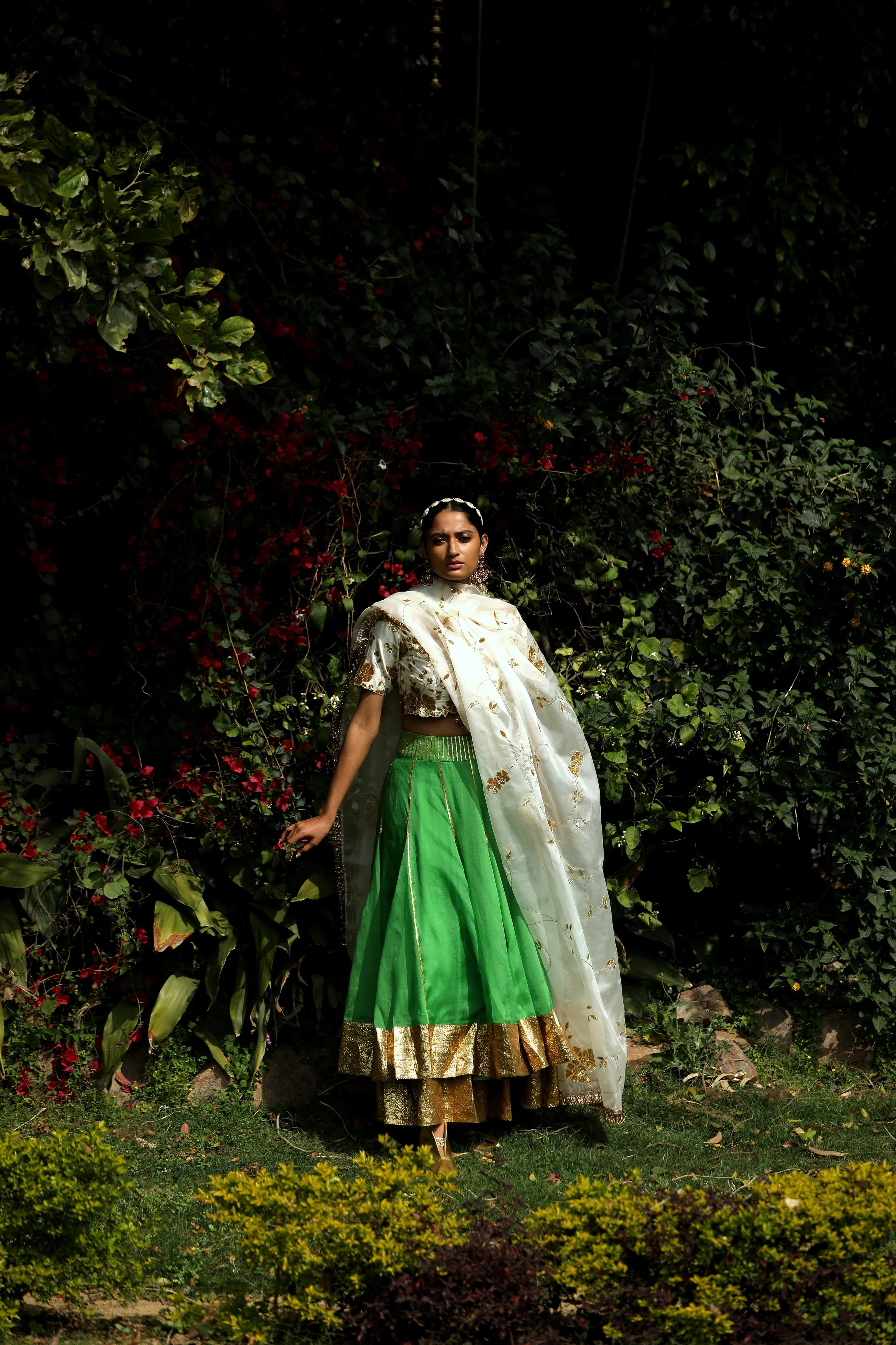 A Bright Green Organza ankle length lehenga highlighted with double gota border worn with a chanderi hand embroidered blouse in sequins with an organza embroidered dupatta highlighted with kiran in Offwhite.