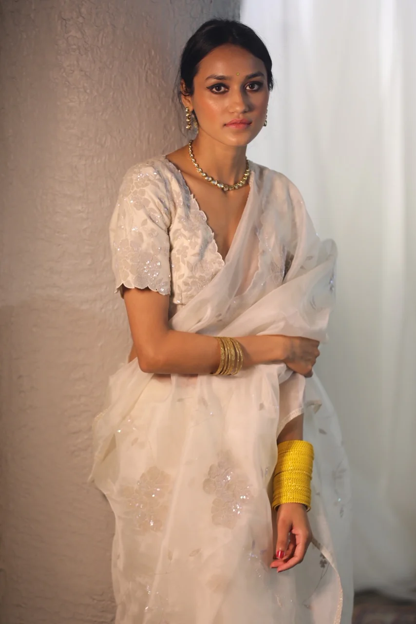 The model wears a sequins hand embroidered organza sari with the same embroidered blouse in chanderi all in Offwhite.