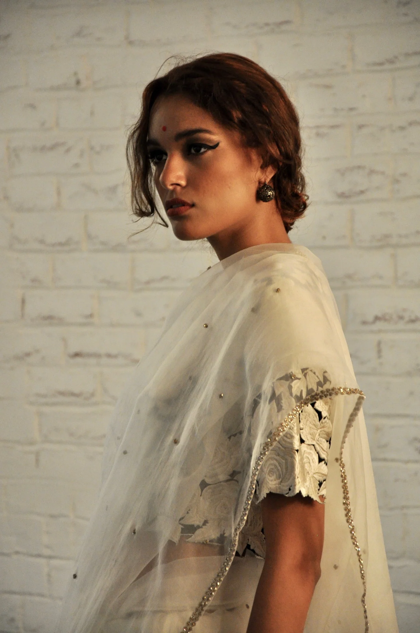 A black and ivory embroidered blouse worn with an Ivory organza sari highlighted on edges and sprinkles.
