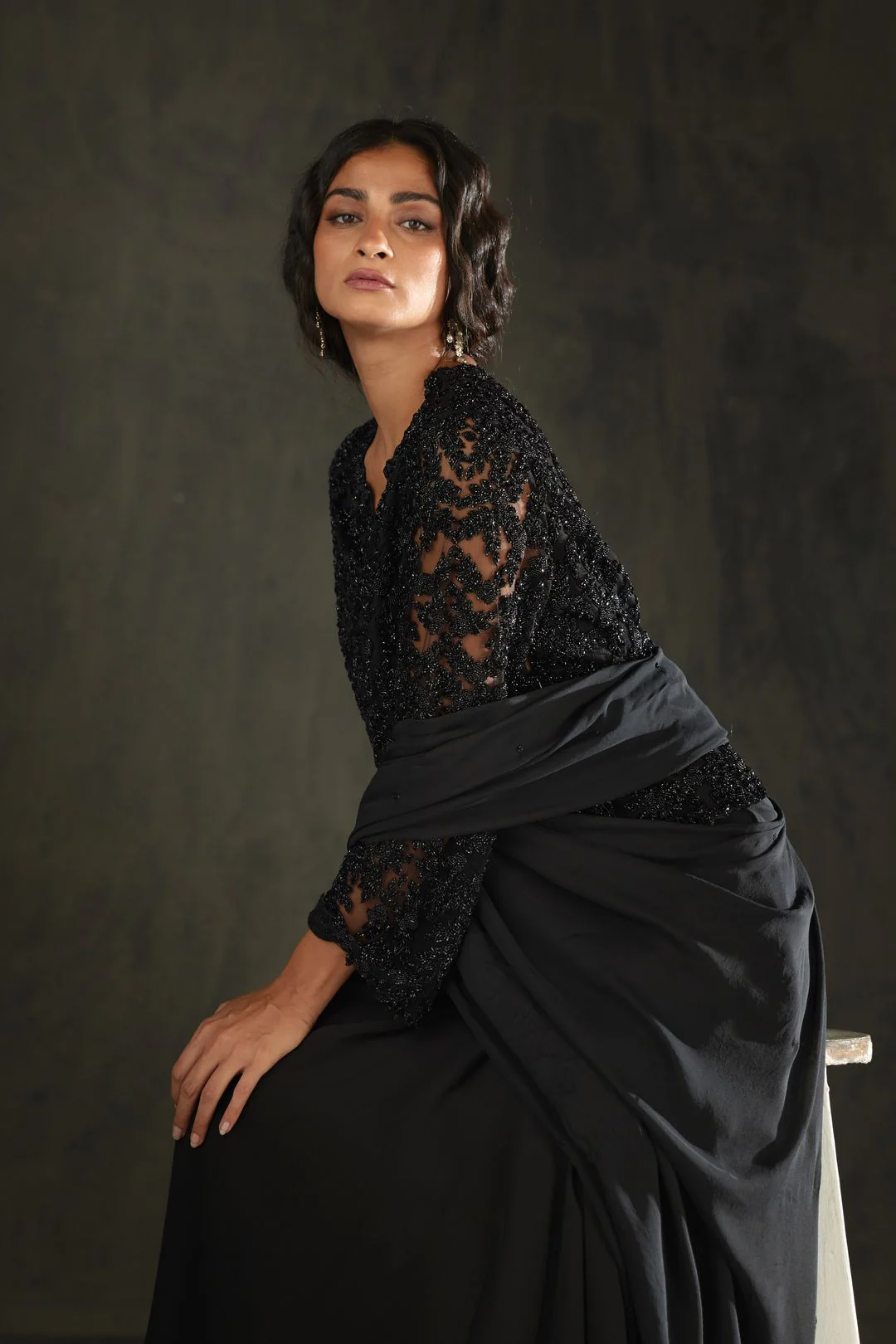 A black tulle hand embroidered with black glassbeads long blouse worn with a predraped lungi sari in crepe and silk chiffon.