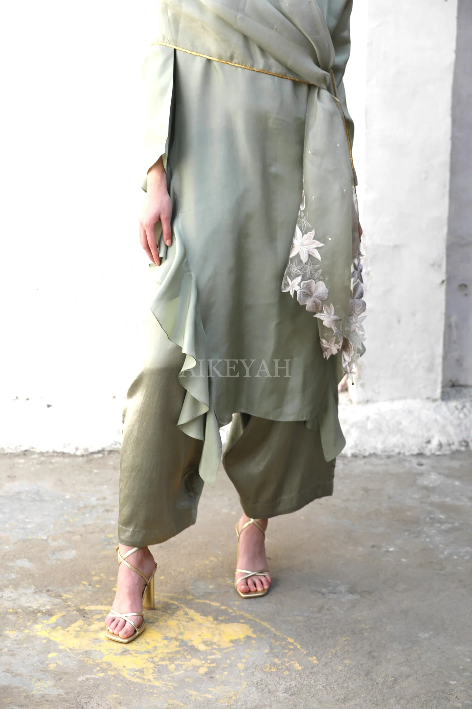 A silk kurta worn with mashru pants and an organza embroidered dupatta OR an embroidered gold collar.