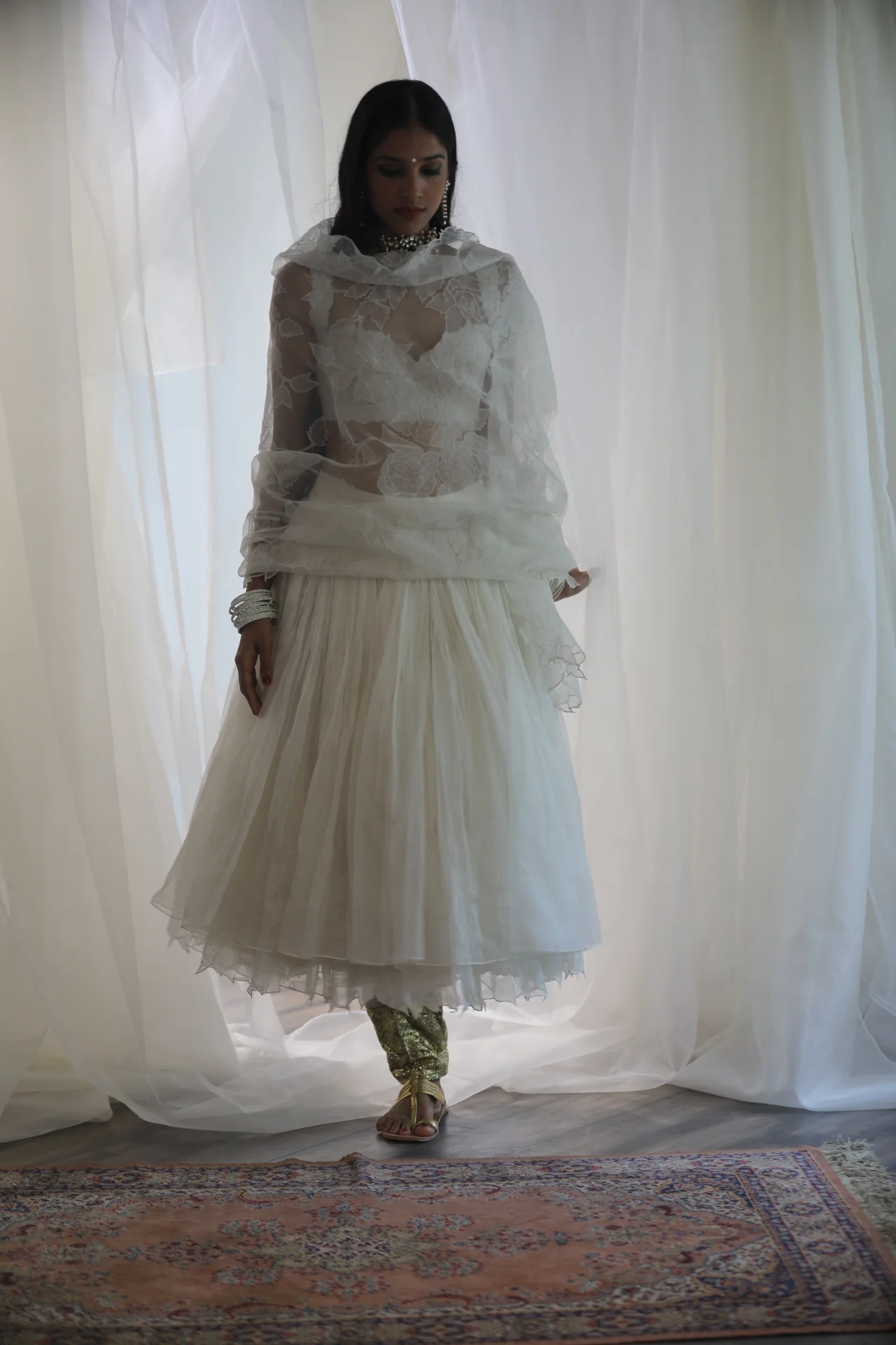 A quilted silk bralette is worn with a poofy organza skirt with applique details in the under layer and a chanderi salwar highlighted with thick gota and a signature applique organza dupatta.