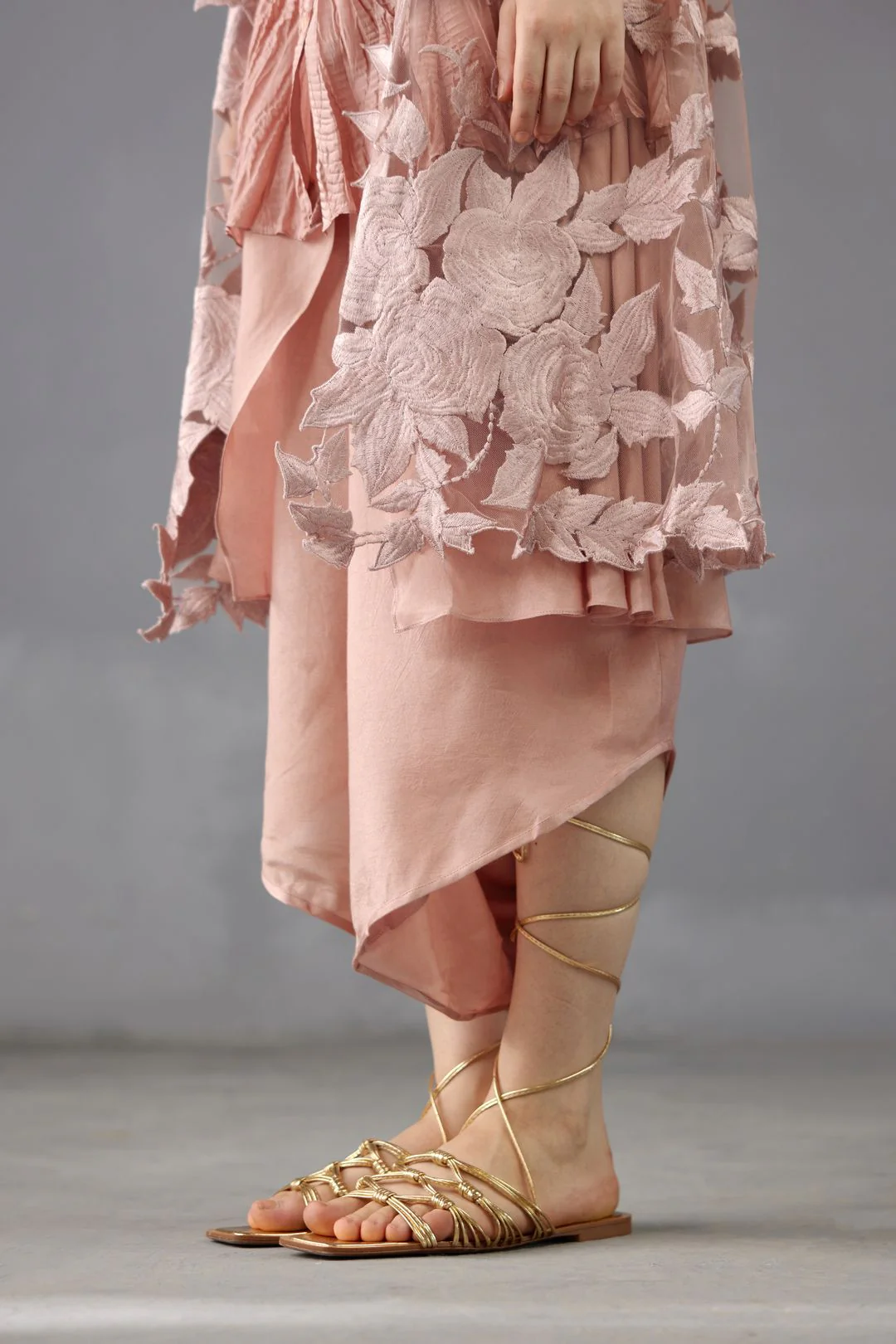 Crushed habutai silk shirt worn with low crotch pants in shantoon styled with aikeyah's signature floral thread embroidered overlay in tulle.