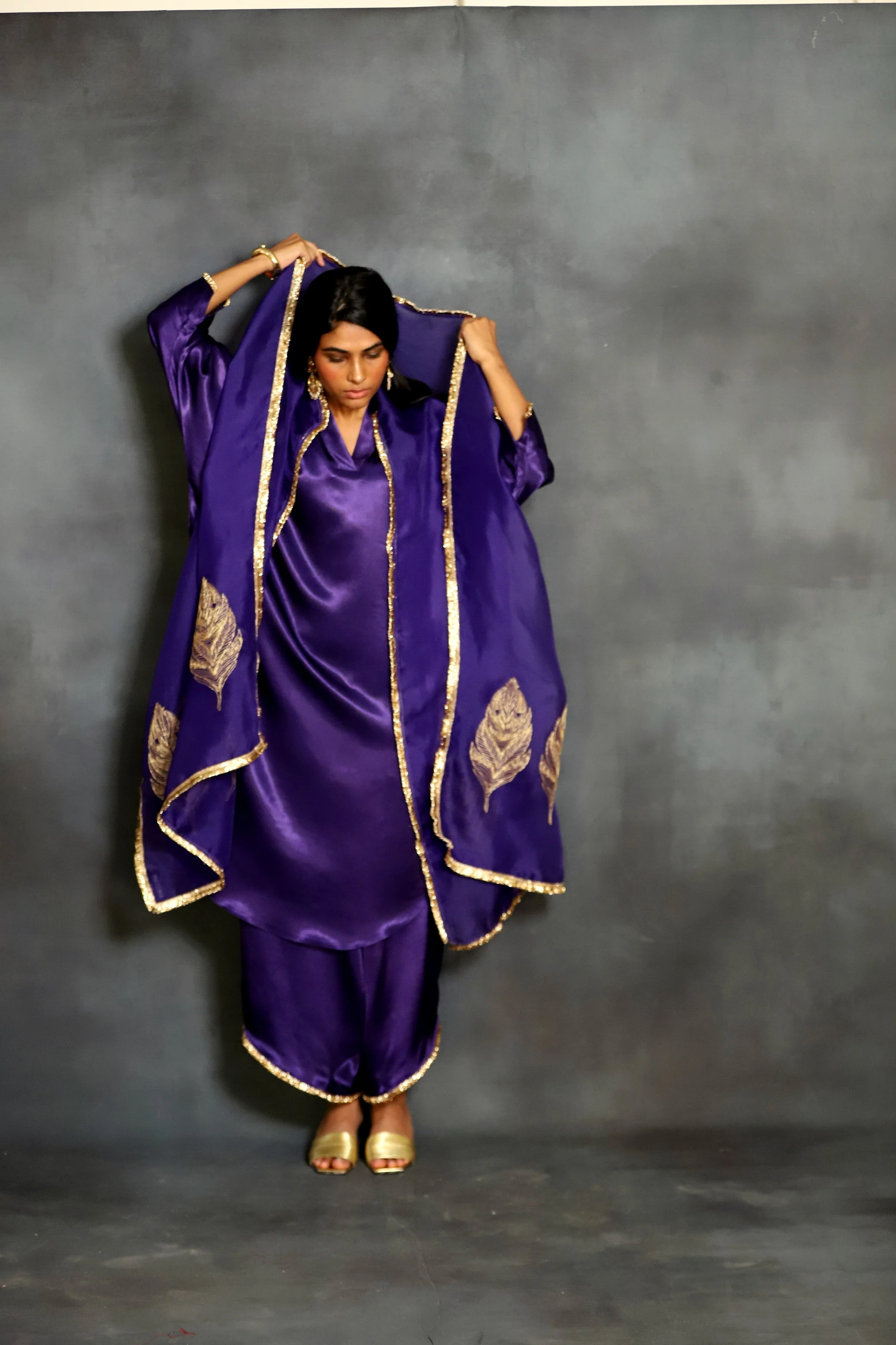 A mashru silk kaftan tunic worn with low crotch pants highlighted with gold kiran and adorned with an organza embroidered dupatta.