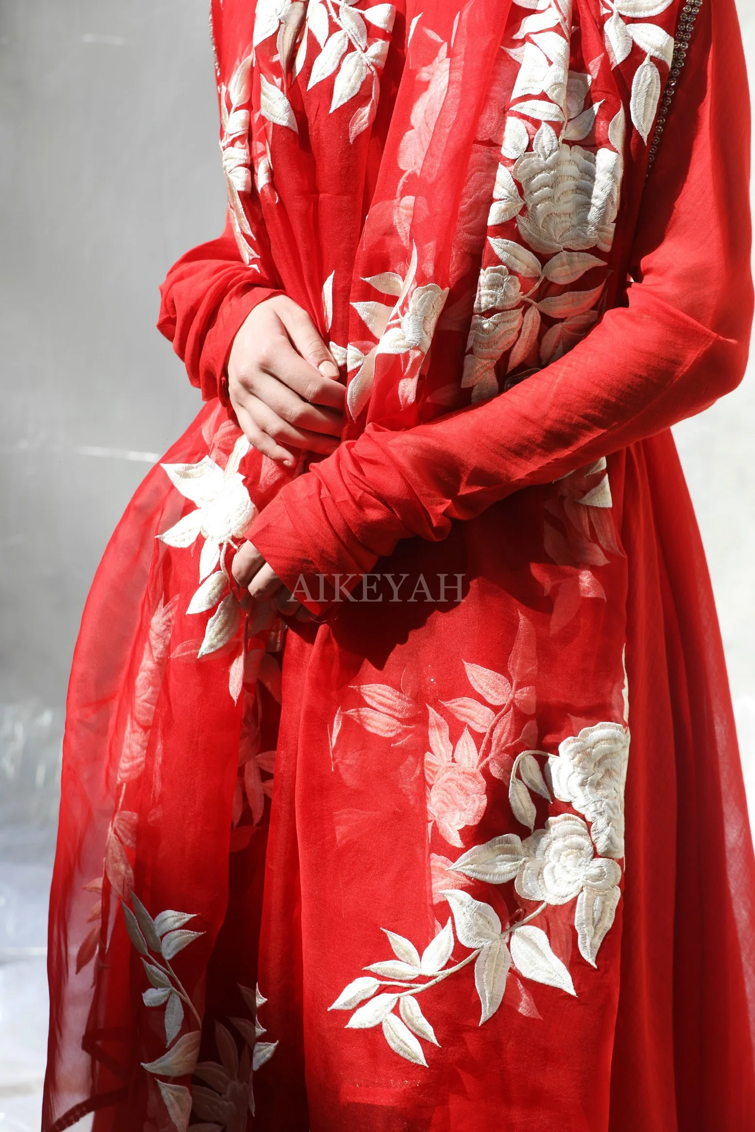 A Chanderi gherdaar, churidaar sleeves kurta worn with mashru straight pants and an organza dupatta embroidered in ivory thread signature floral.