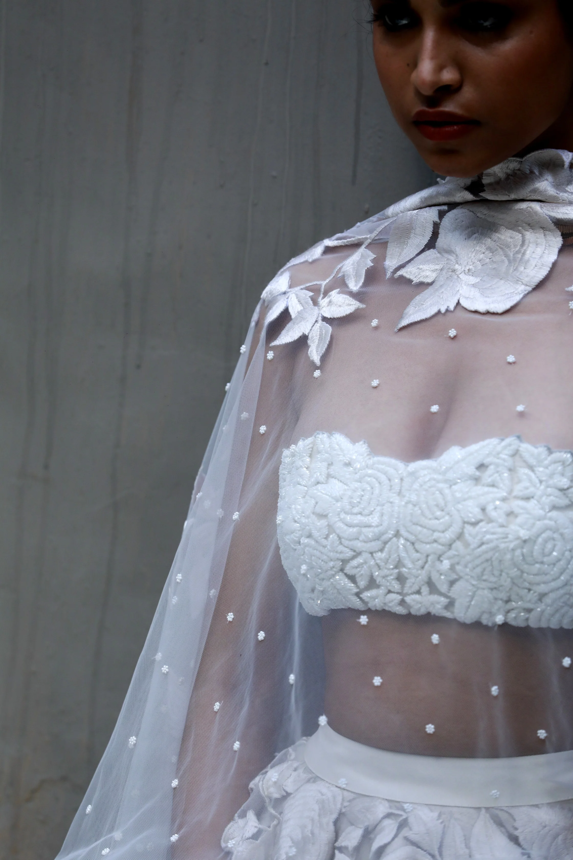 A floral thread embroidered tiered layered lehenga worn with a glass beads embroidered bandeau or a thread embroidered blouse and an embroidered tulle dupatta.