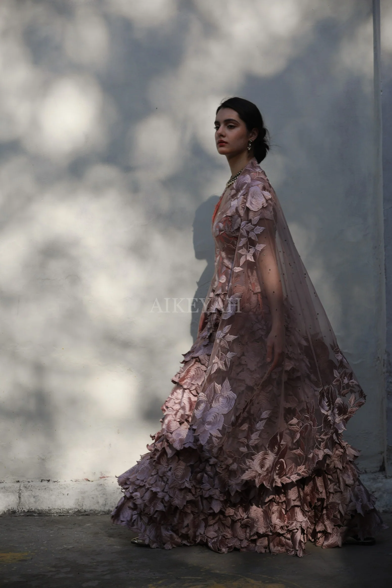 A floral thread embroidered tiered layered lehenga worn with a thread embroidered blouse and an embroidered tulle dupatta.