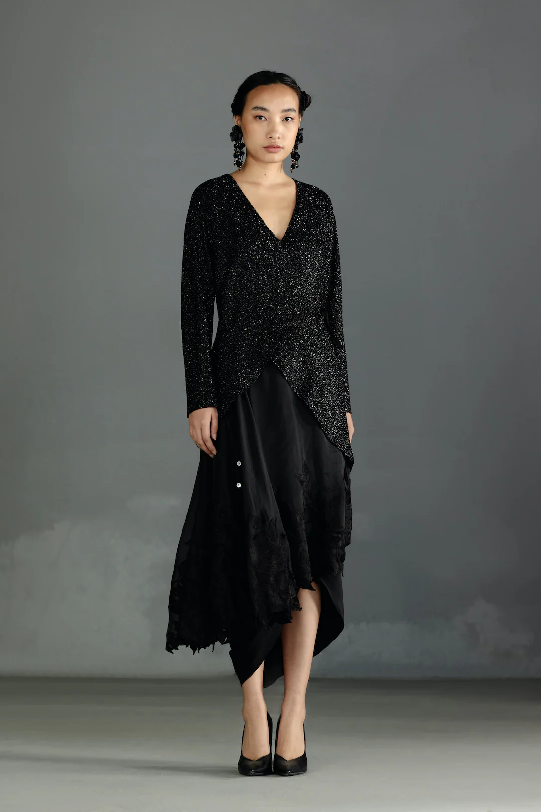 A fully glass beads embellished double breasted jacket in tulle worn with a crepe / embroidered organza layered cowl skirt.