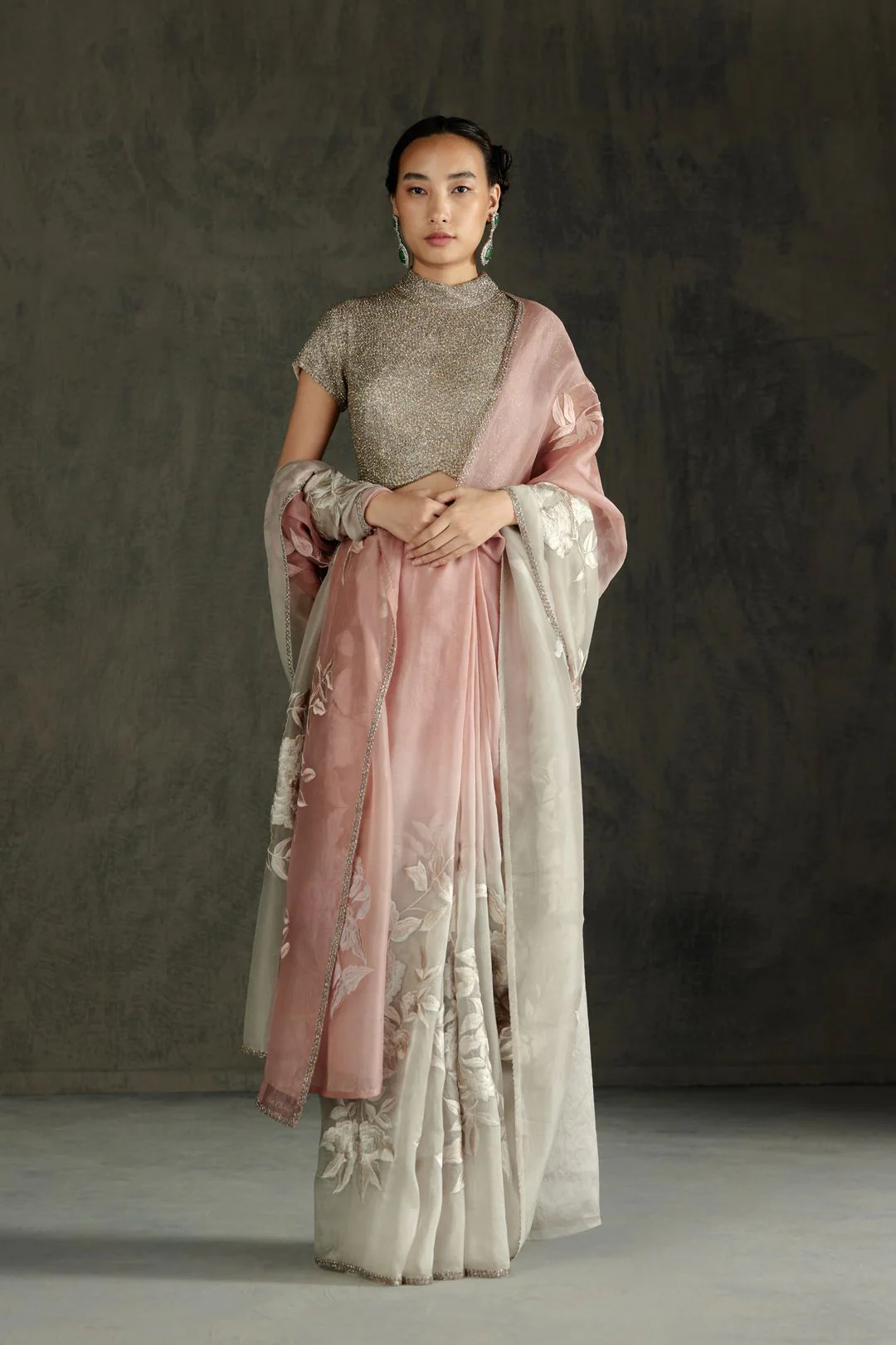 A fully embellished glassbeads embroidered blouse with a back cut out is worn with an ombre dyed thread embroidered sari highlighted with glassbeads.