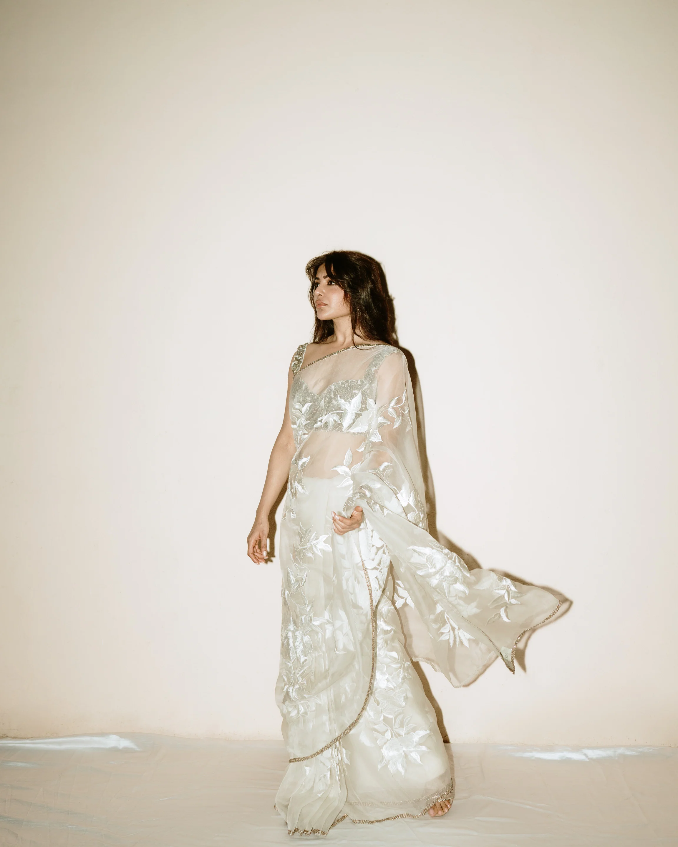 A hand embellished pewter colored glass beads embroidered bralette is worn with an Offwhite thread embroidered sari highlighted with glass beads.