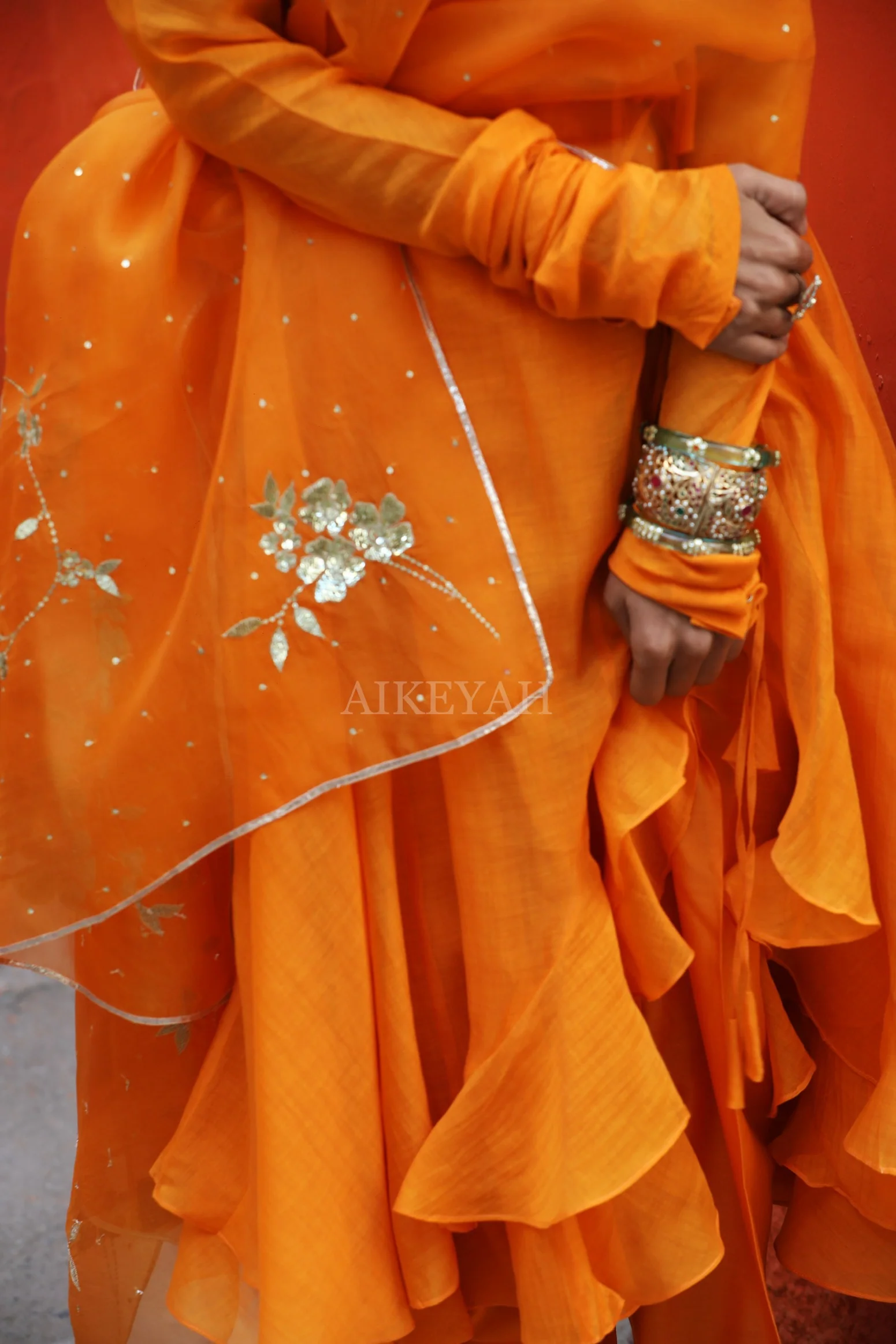 A light chanderi kalidar worn with a salwar and a hand embroidered dupata all in Pumpkin yellow Color.