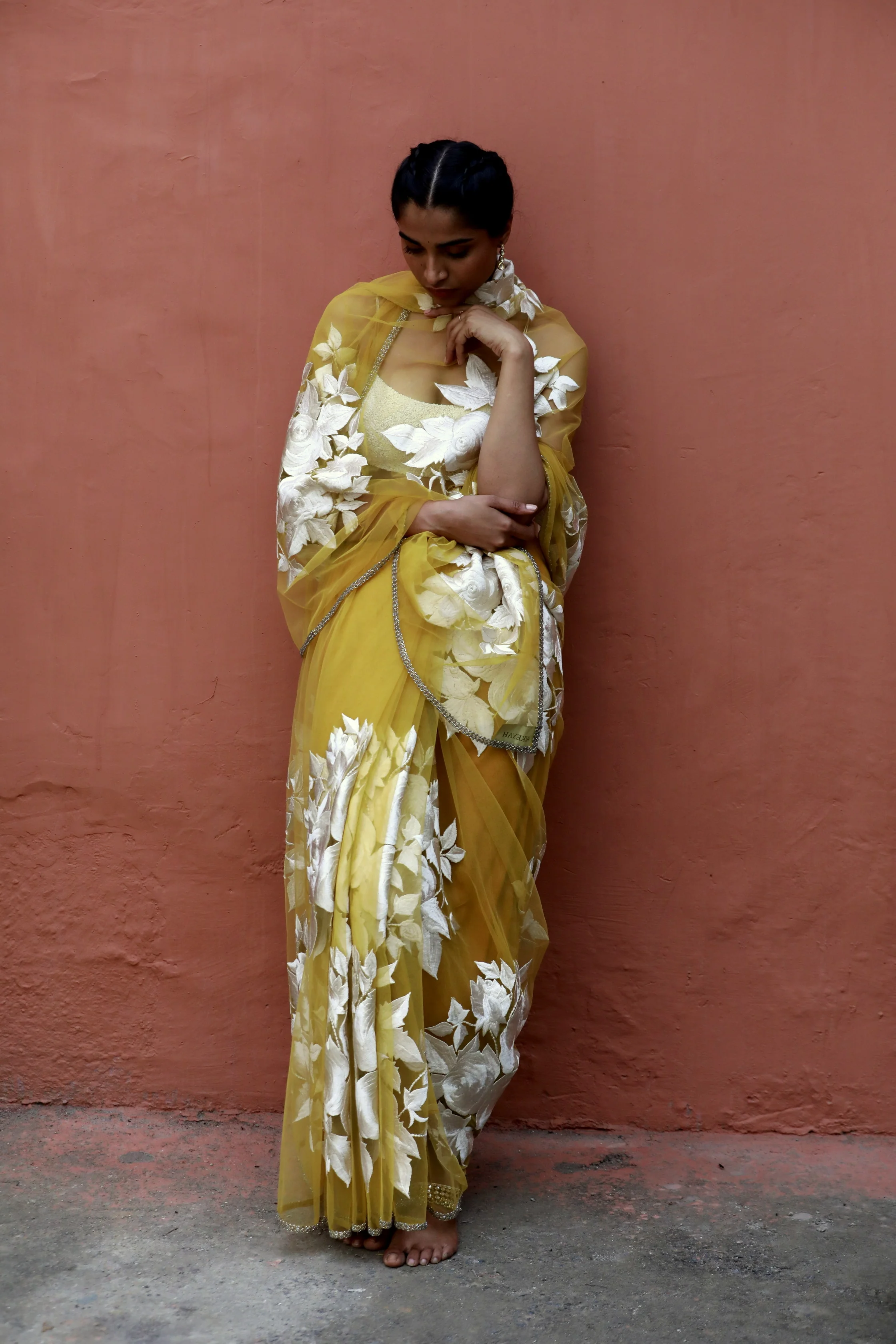 An ochre tulle sari embroidered with ivory signature floral.