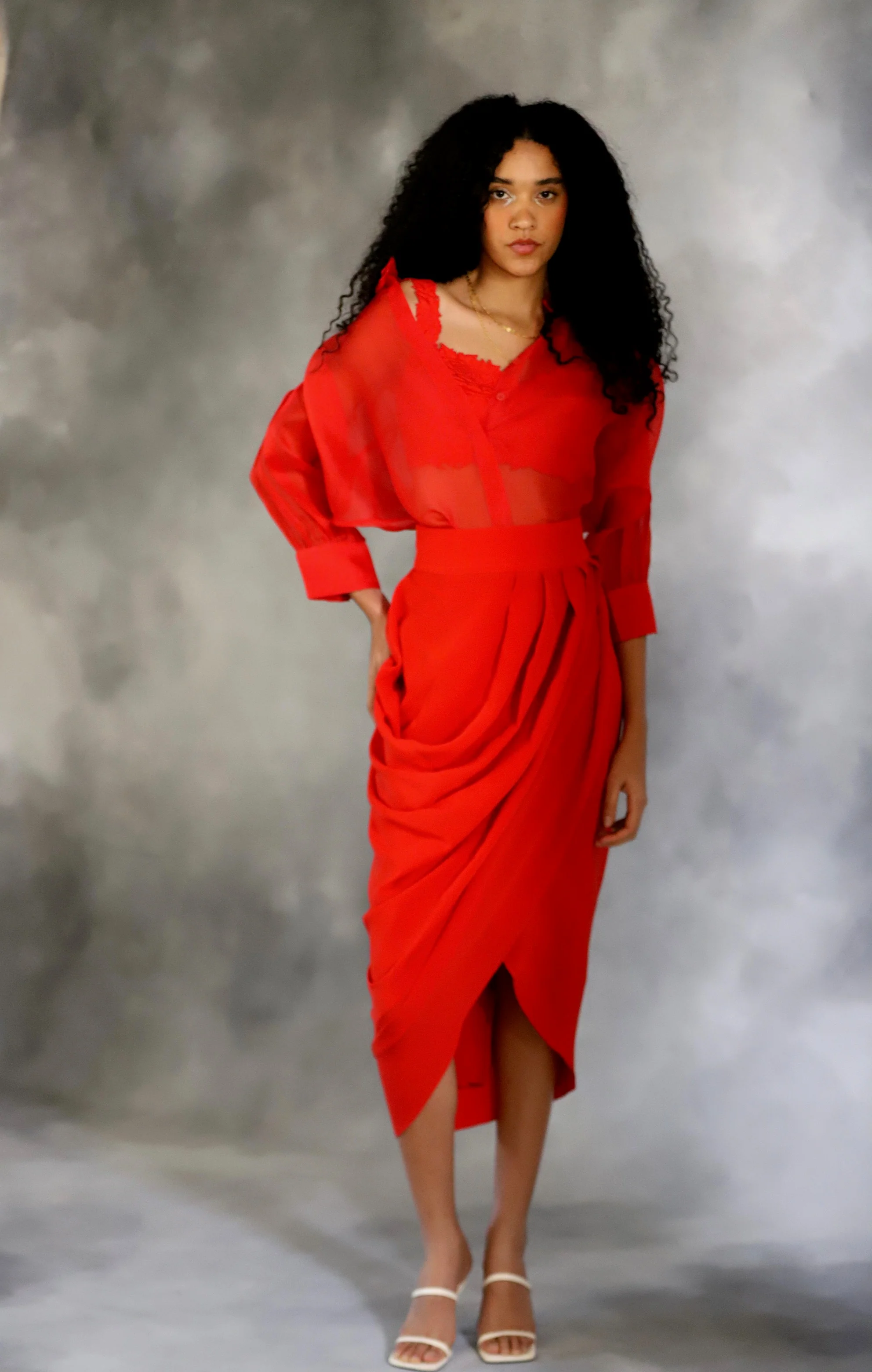 An organza shirt worn with a quilted silk bralette clubbed with a crepe cowl skirt.