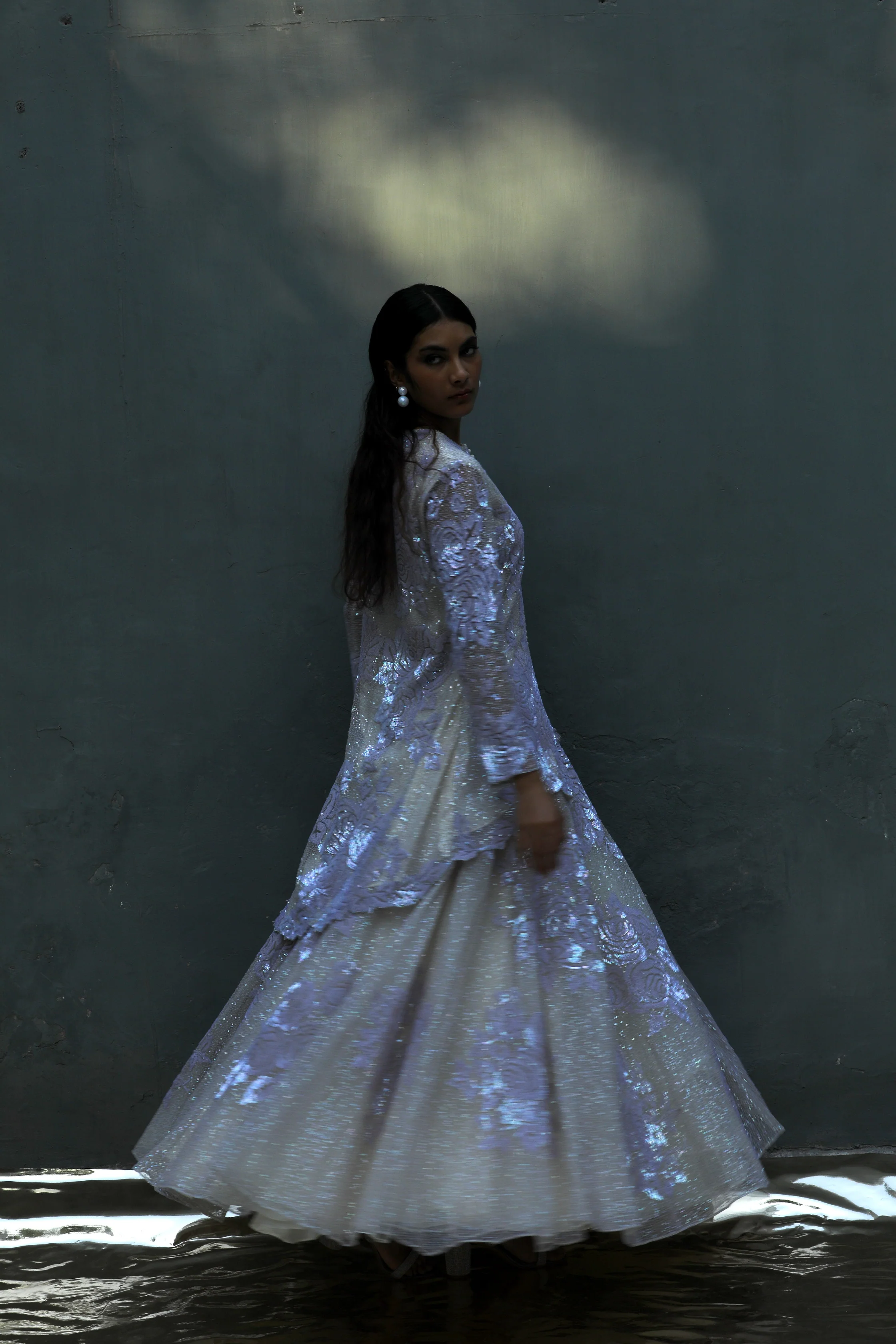 Tiny Iridescent sequins hand embroidered on tulle in Signature florals onto a button down top and a full flare skirt.