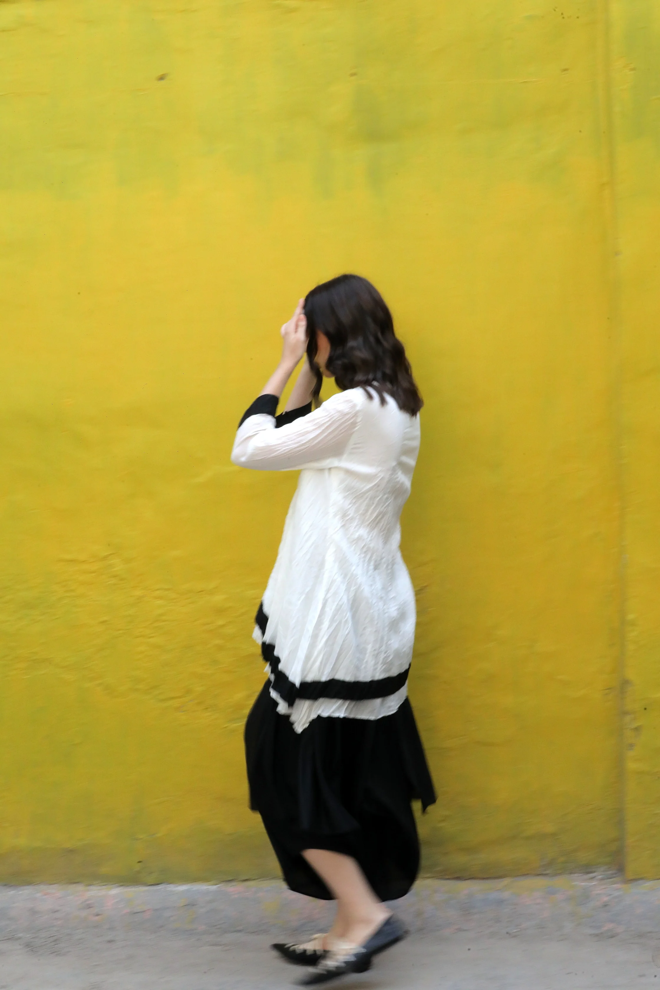 A cotton silk crushed single button asymmetric top highlighted with black border worn with a black modal signature flap pants.