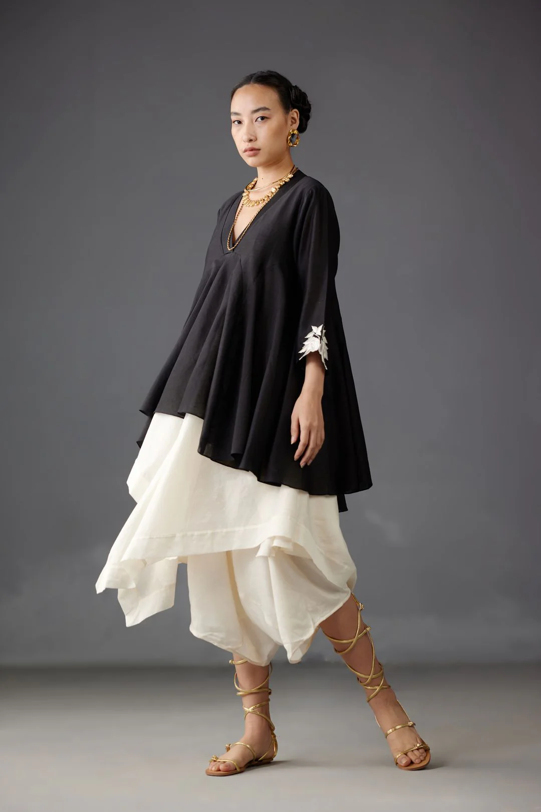 Chanderi tiered assymetric tunic in black/ offwhite embroidered on sleeves worn with signature low crotch pants in shantoon.