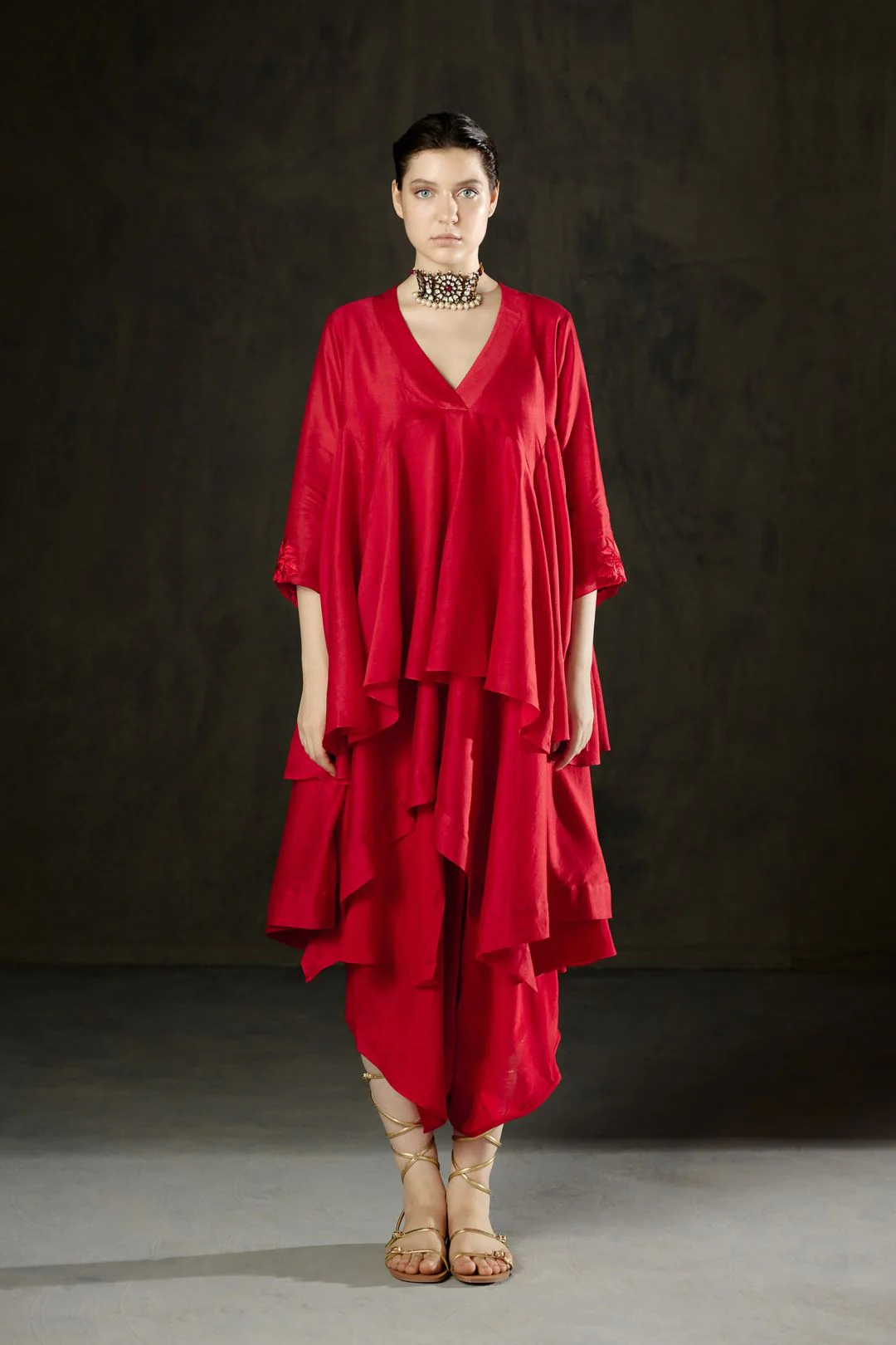 A bright red chanderi layered assysmetric tunic highlighted with tonal thread embroidery on sleeves is worn with aikeyah's signature lowcrotch pants in shantoon.