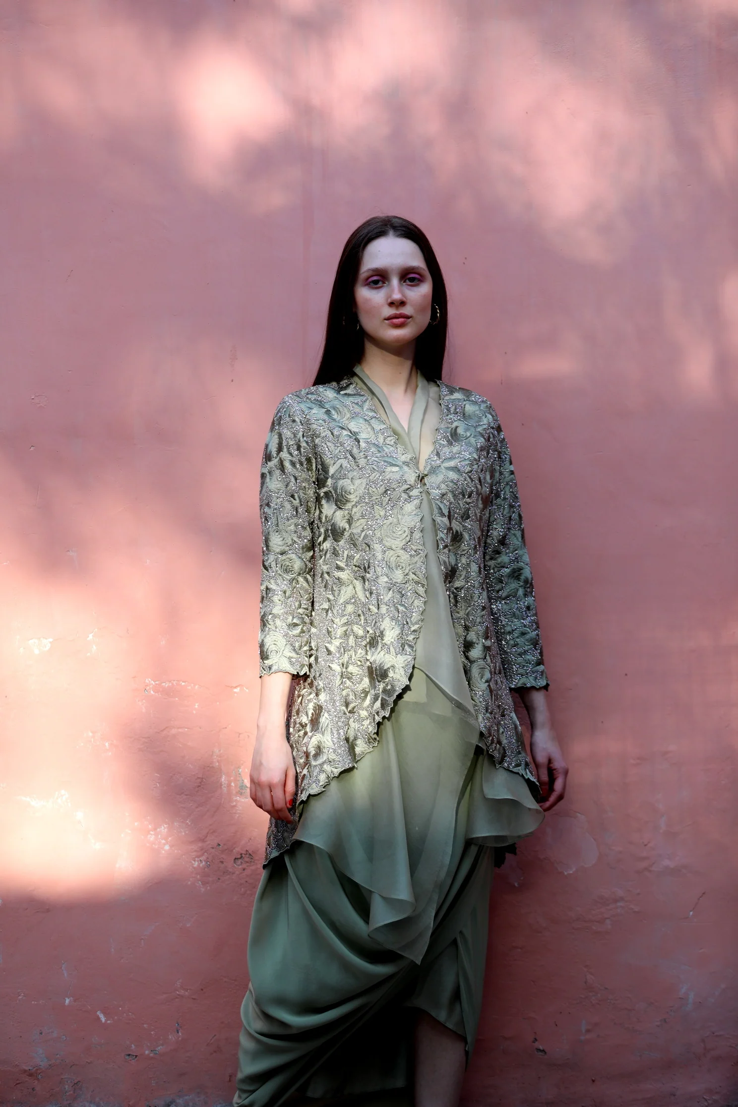 An Olive Green jacket embroidered and embellished with threads and glass beads is worn with an Organza sheer top and a crepe Cowl skirt.
