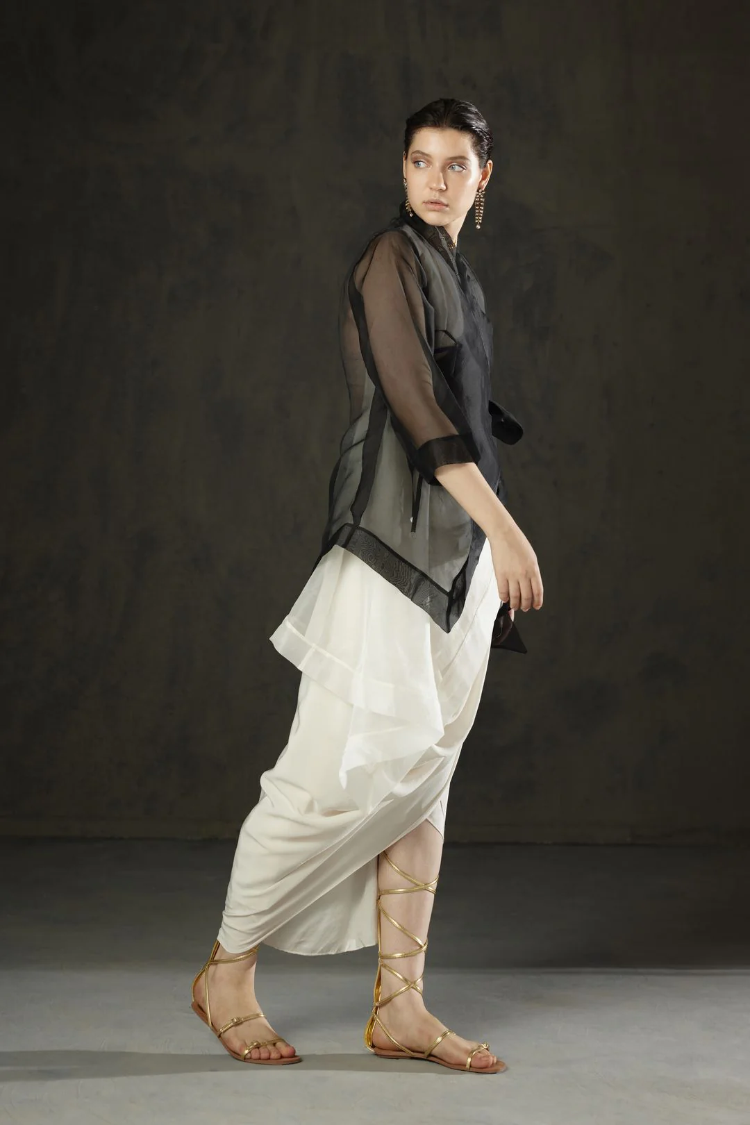 An organza layered jacket/top worn with a crepe cowl skirt.