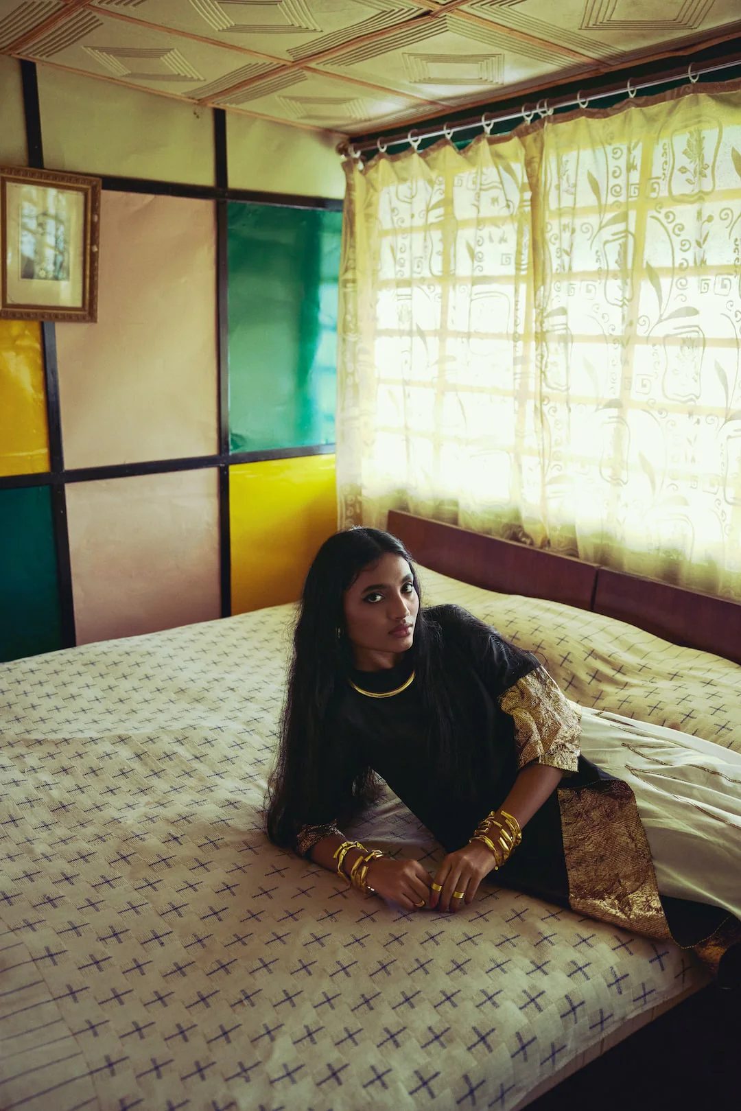 A layered kalidar kurta in chanderi highlighted with gota is worn with a salwar.