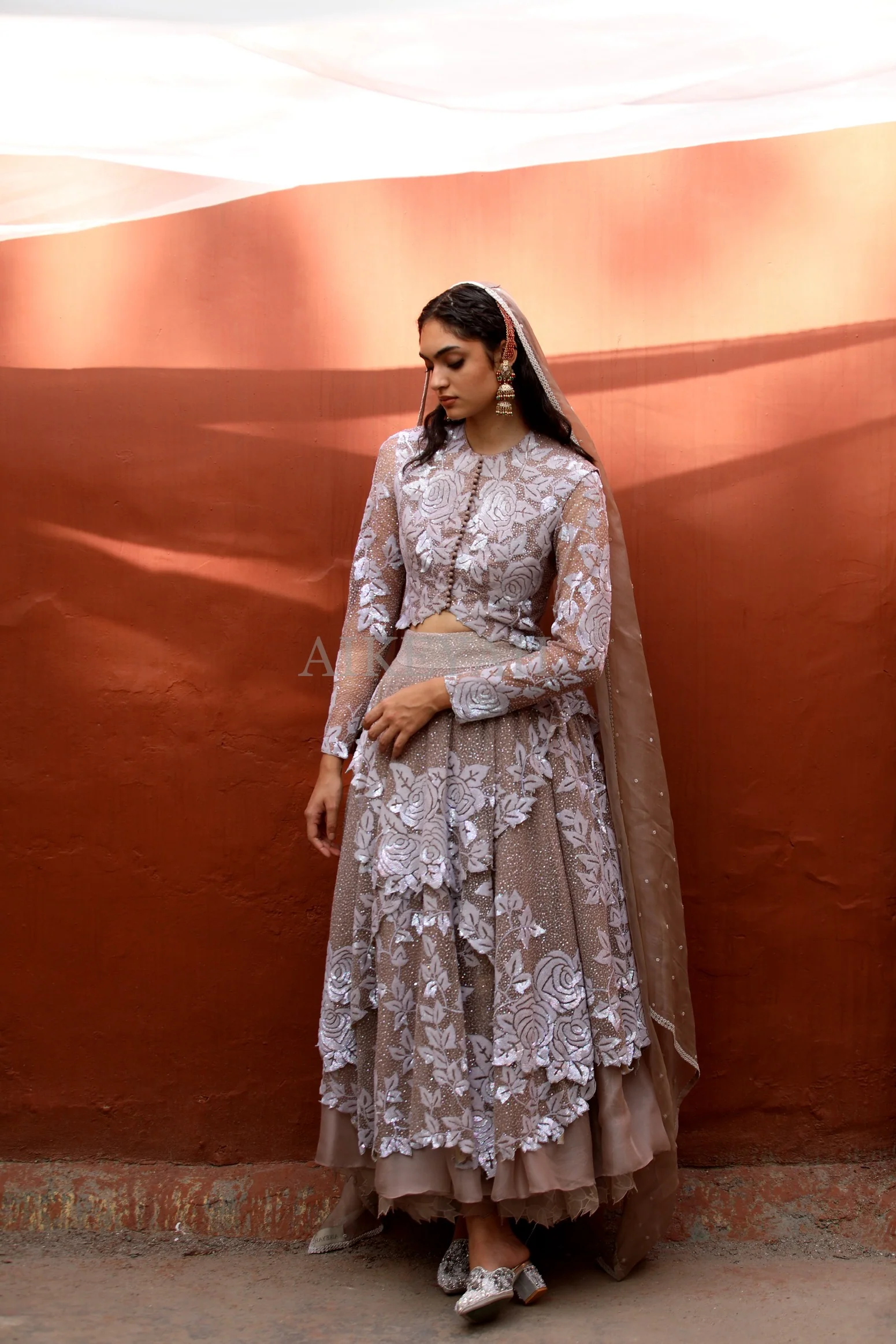An Iridescent sequins hand embroidered multi layered skirt worn over an organza gathered skirt and a button down blouse.