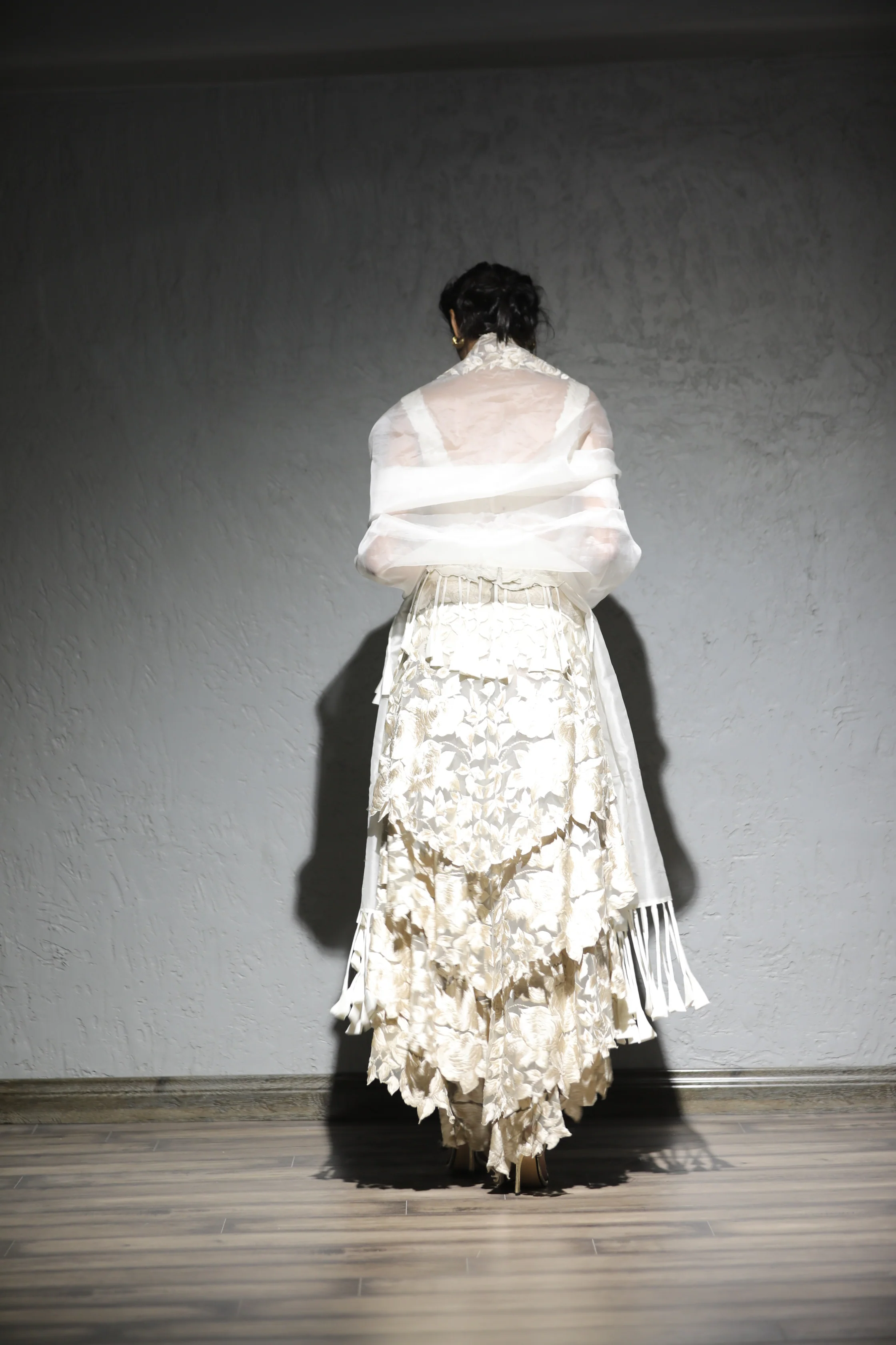 An offwhite thread embroidered 4 tiered skirt in tulle is worn with a silk floral quilted bralette and an organza dupatta embroidered and highlighted with tassels.